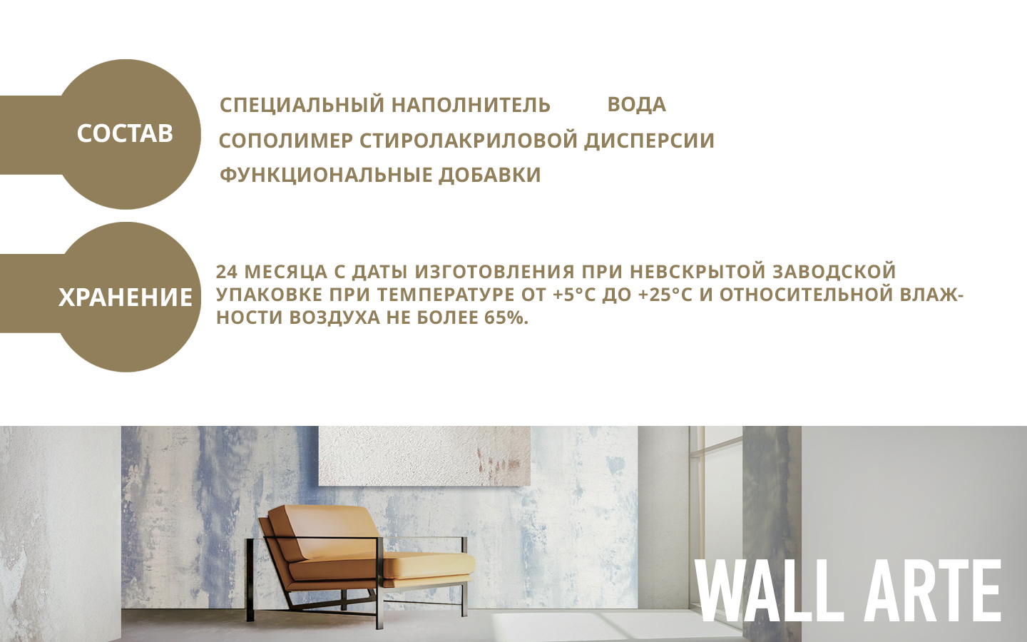 СОСТАВ: Специальный наполнитель, вода, сополимер стиролакриловой дисперсии, функциональные добавки.
