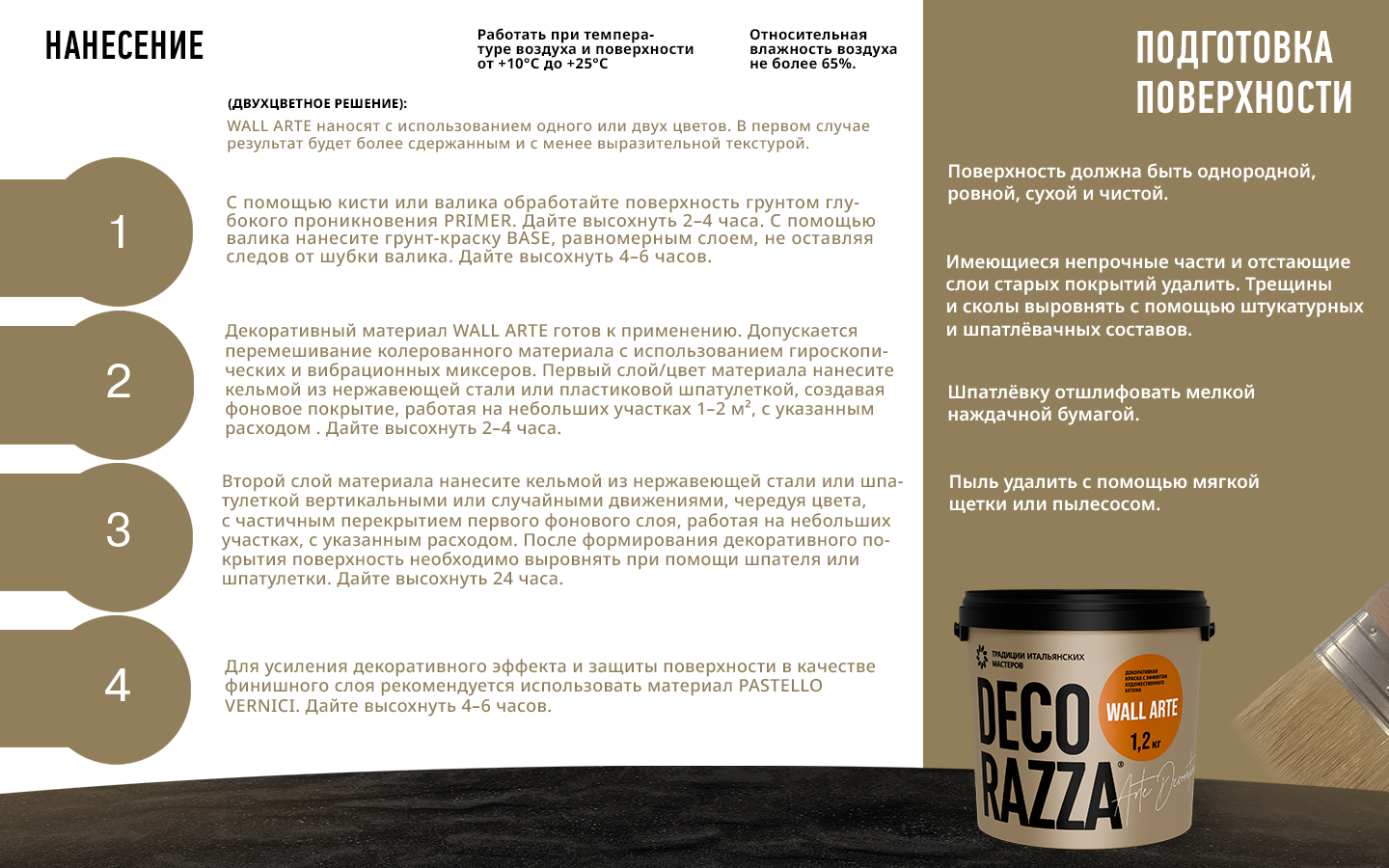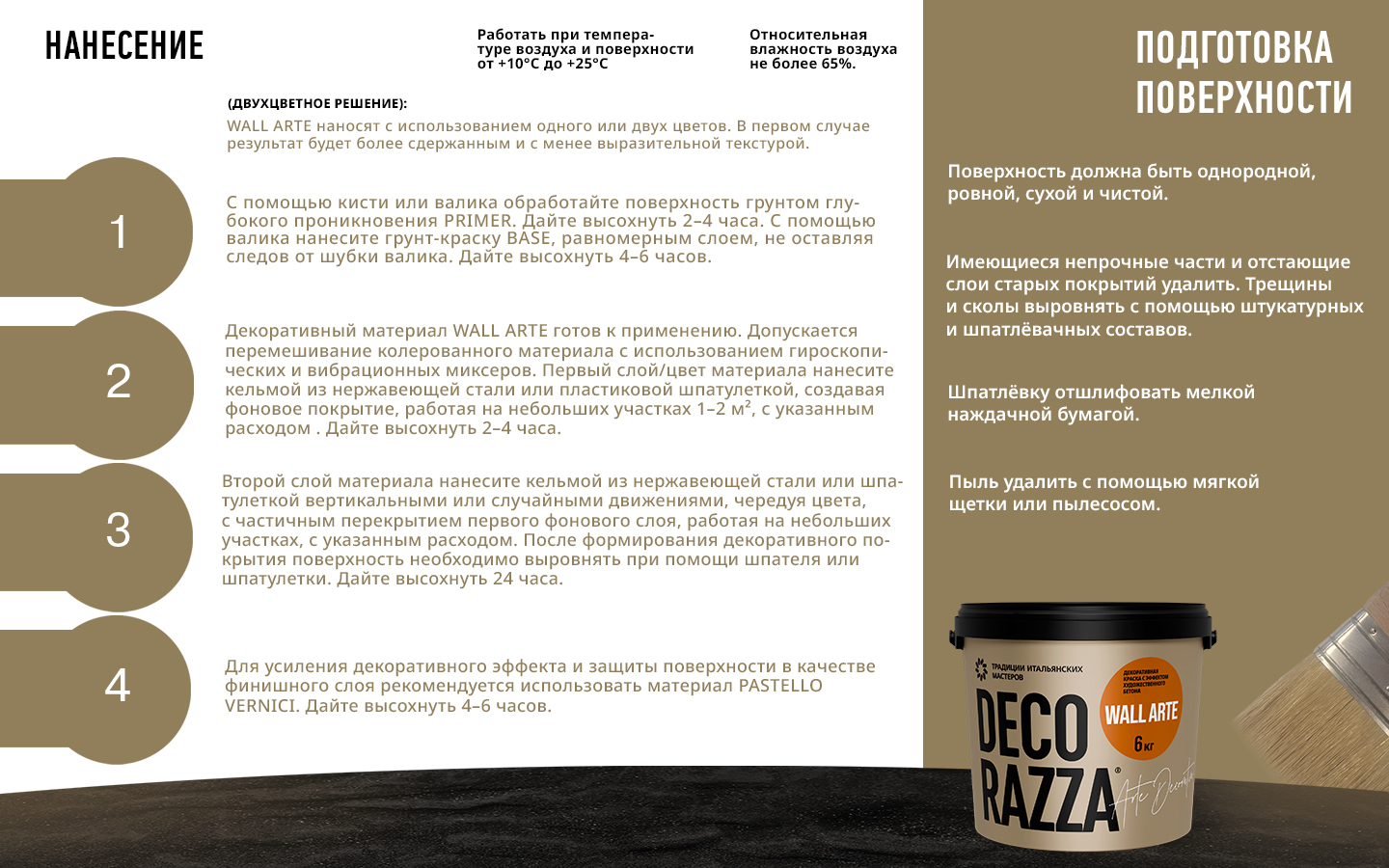 3. Декоративный материал Wall Artе готов к применению. Допускается перемешивание колерованного материала с использованием гироскопических и вибрационных миксеров