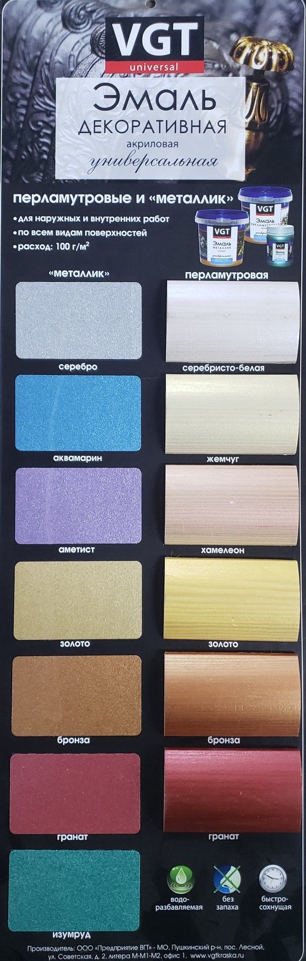 Универсальная акриловая эмаль с натуральным металлическим блеском, высокой свето-, водо- и атмосферостойкостью. Выпускается в нескольких цветах : «золото», «бронза», «серебро», «аметист», «гранат», «аквамарин», «изумруд» от официального представителя торговой марки VGT-ecology material по г. Йошкар-Ола и Республике Марий Эл.