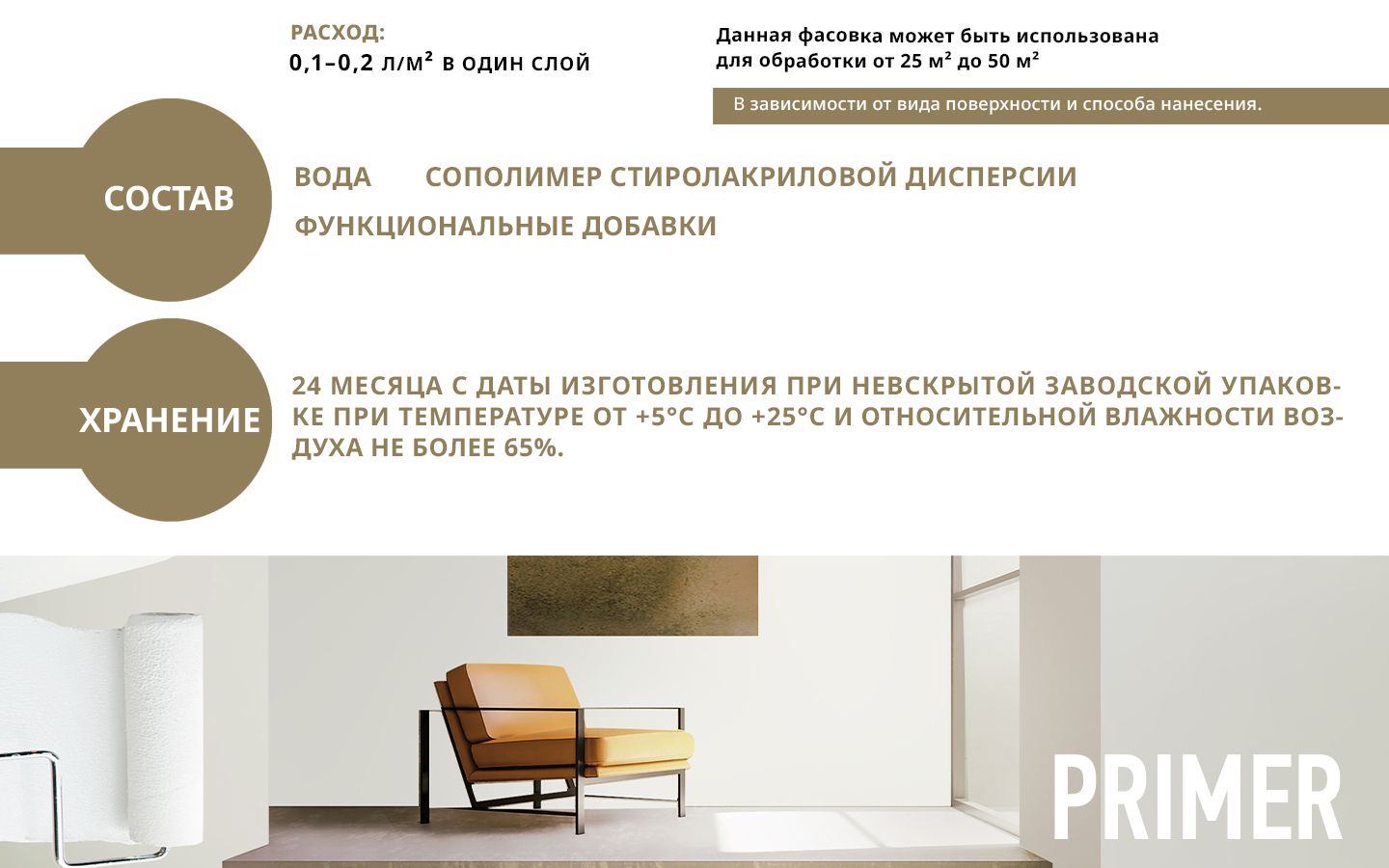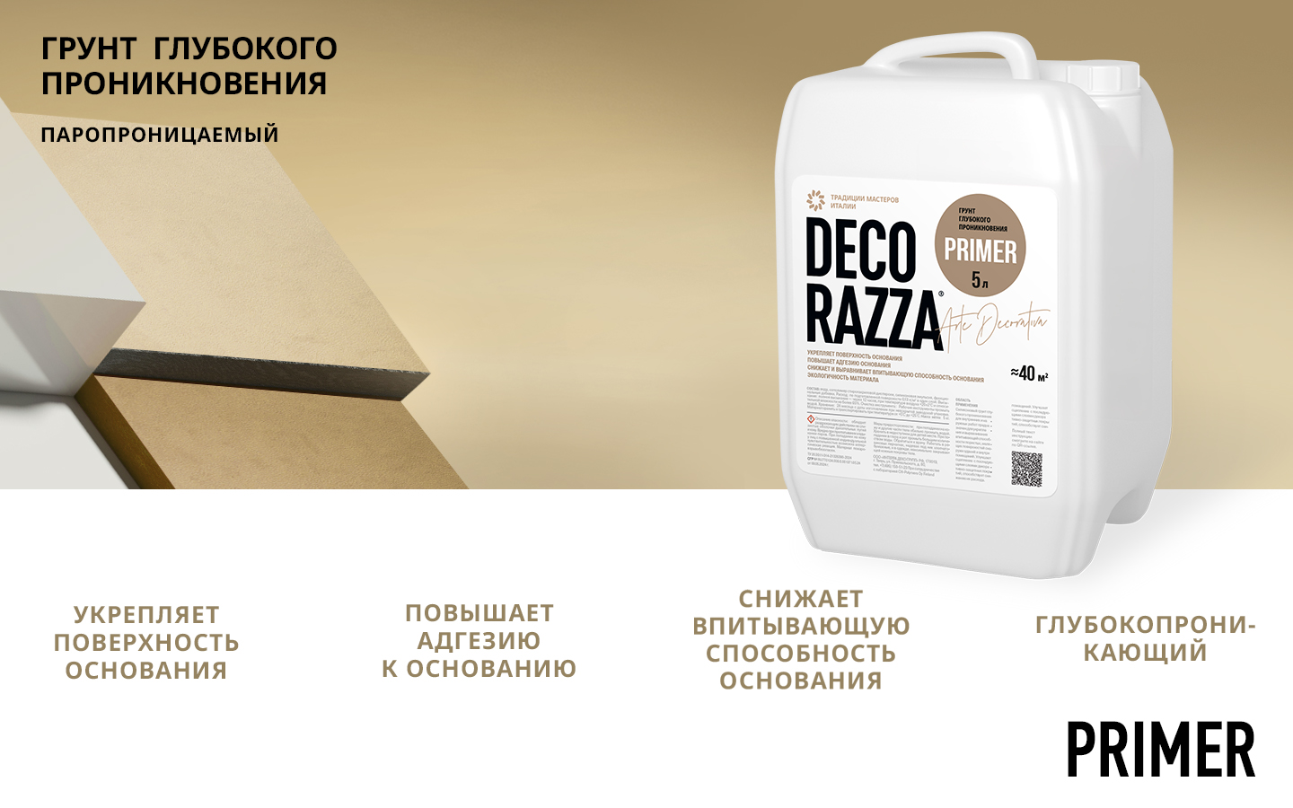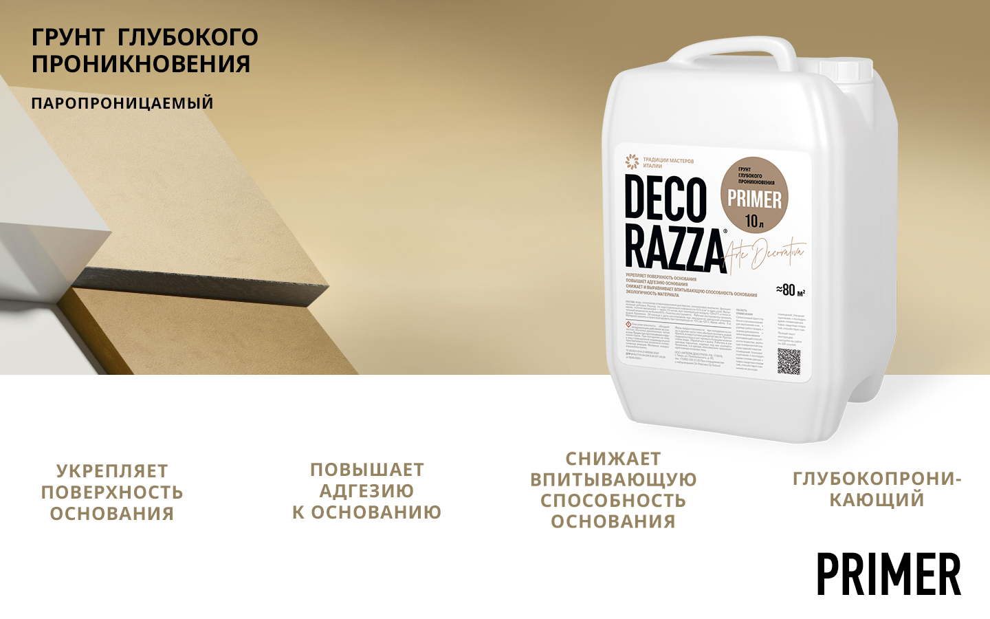 Грунт Decorazza PRIMER — это высококачественная акриловая грунтовка, специально разработанное для минеральных поверхностей, таких как бетон, кирпич и штукатурка. Его особенность заключается в глубоком проникновении, что обеспечивает надежную основу для последующих отделочных работ. Благодаря своей формуле, Decorazza PRIMER обладает укрепляющими свойствами, повышая прочность и долговечность поверхностного слоя.