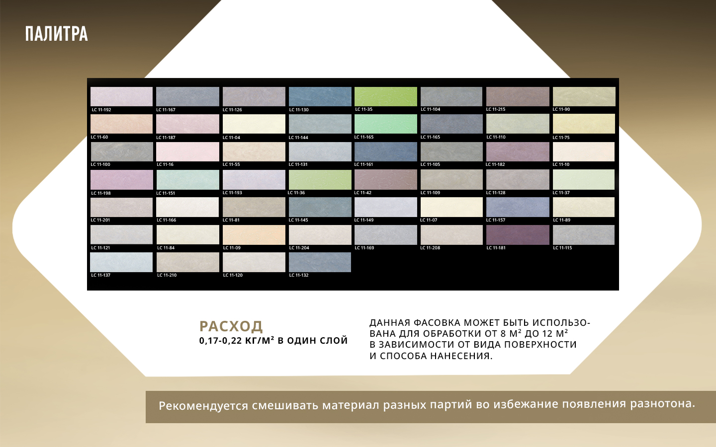 Декоративная краска Lucetezza с перламутром и кварцевыми частицами позволяет создавать запоминающиеся эффекты с переливами и переходами цвета, в том числе роскошный «Клондайк NERO» и брутальный декор «Сварные швы». Материал выпускается в 5 базах: серебро, золото, алюминий, бронза, медь, может колероваться в спокойные пастельные и яркие оттенки. Формируемое покрытие с легкой песчаной структурой устойчиво к влажной уборке, экологично, изысканно смотрится в классических и современных интерьерах фотостудий, гостиных, спален, прихожих, столовых в загородных домах, кабинетов и конференц-залов в офисах и на других объектах. Средний расход не превышает 0,2 л/м2.