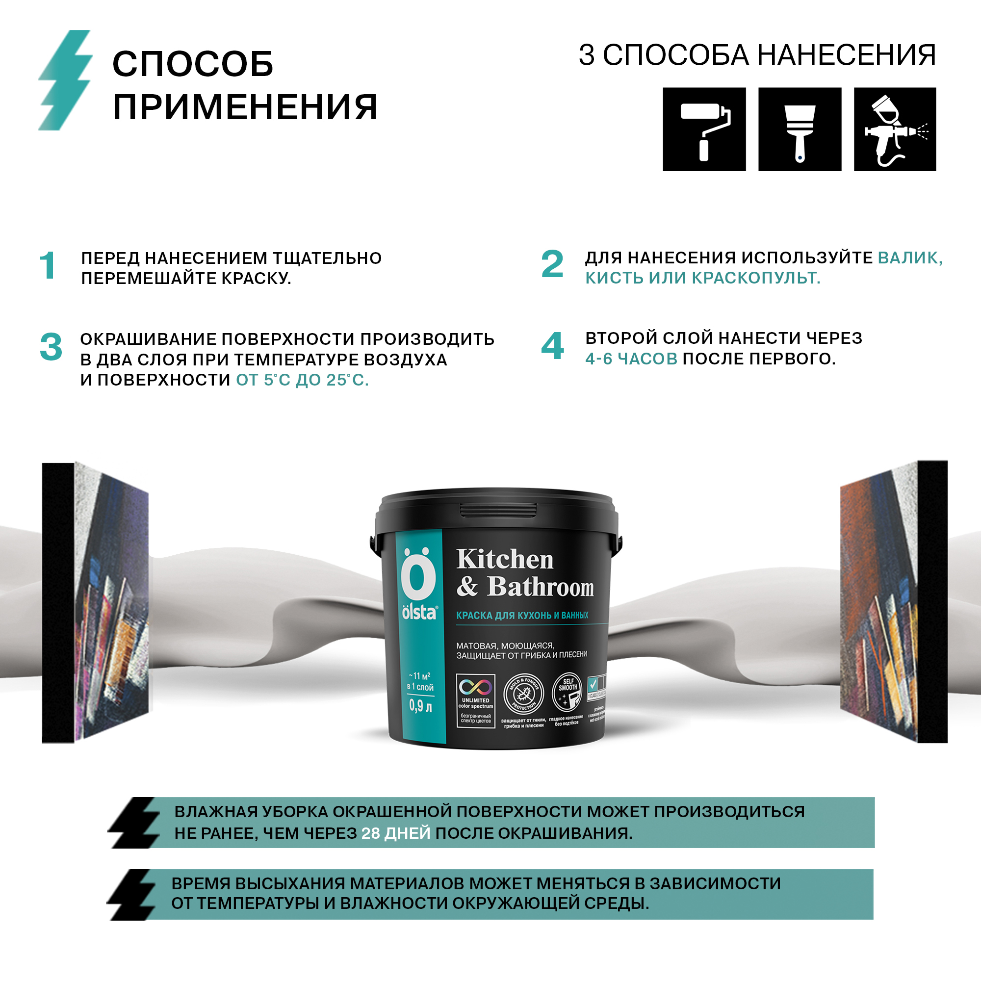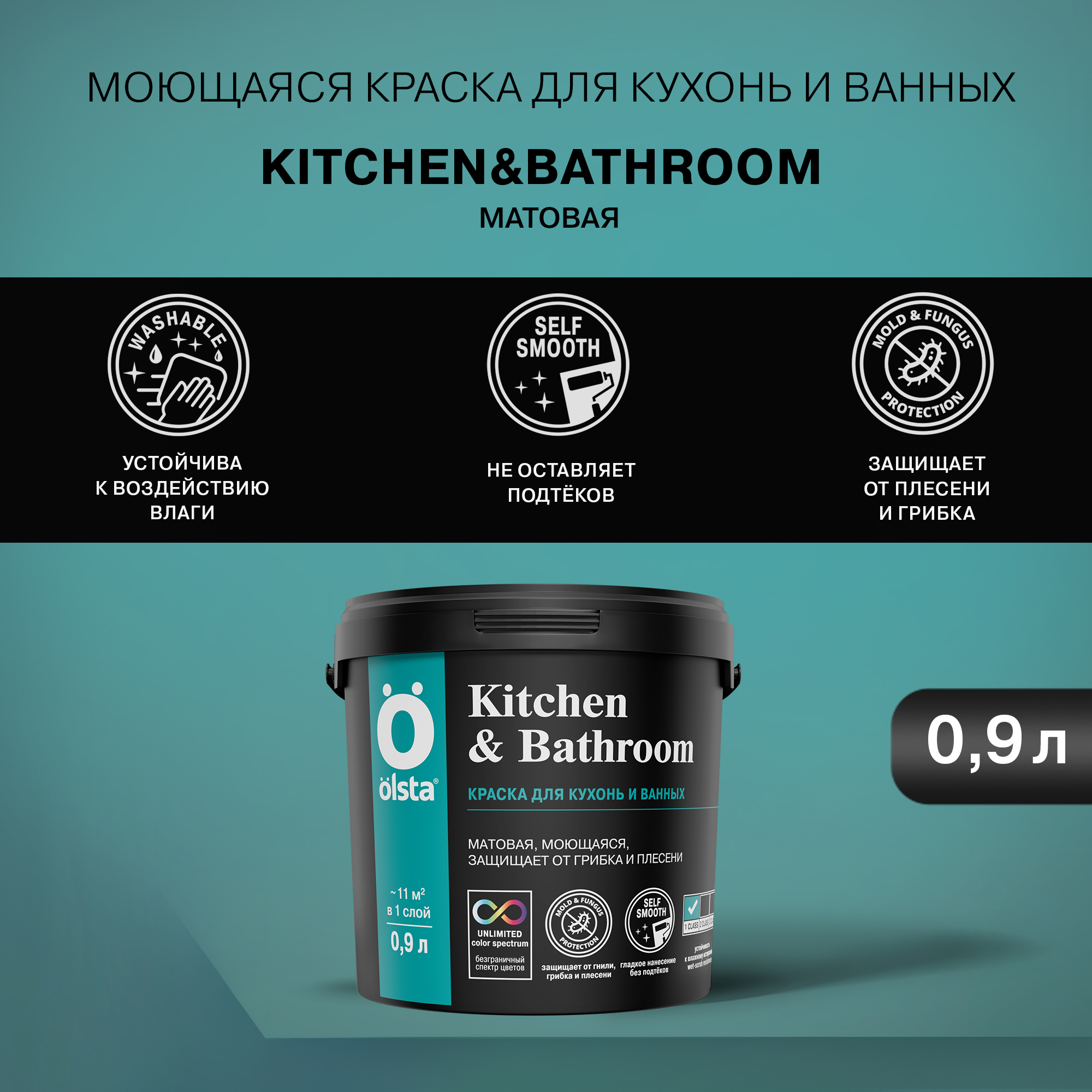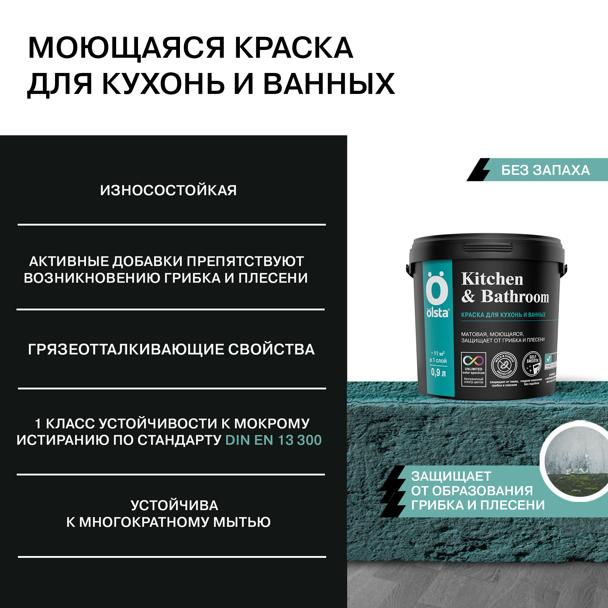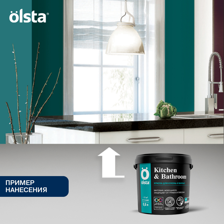 Моющаяся краска Olsta Kitchen & Bathroom формирует на кухнях и в ванных комнатах влагостойкое ультрапрочное покрытие без подтеков. Водно-дисперсионная краска на основе латекса легко очищается от загрязнений, предотвращает риск появления плесневого грибка, устойчива к влажной уборке с бытовыми моющими средствами. Подходит для окрашивания стен и потолков.