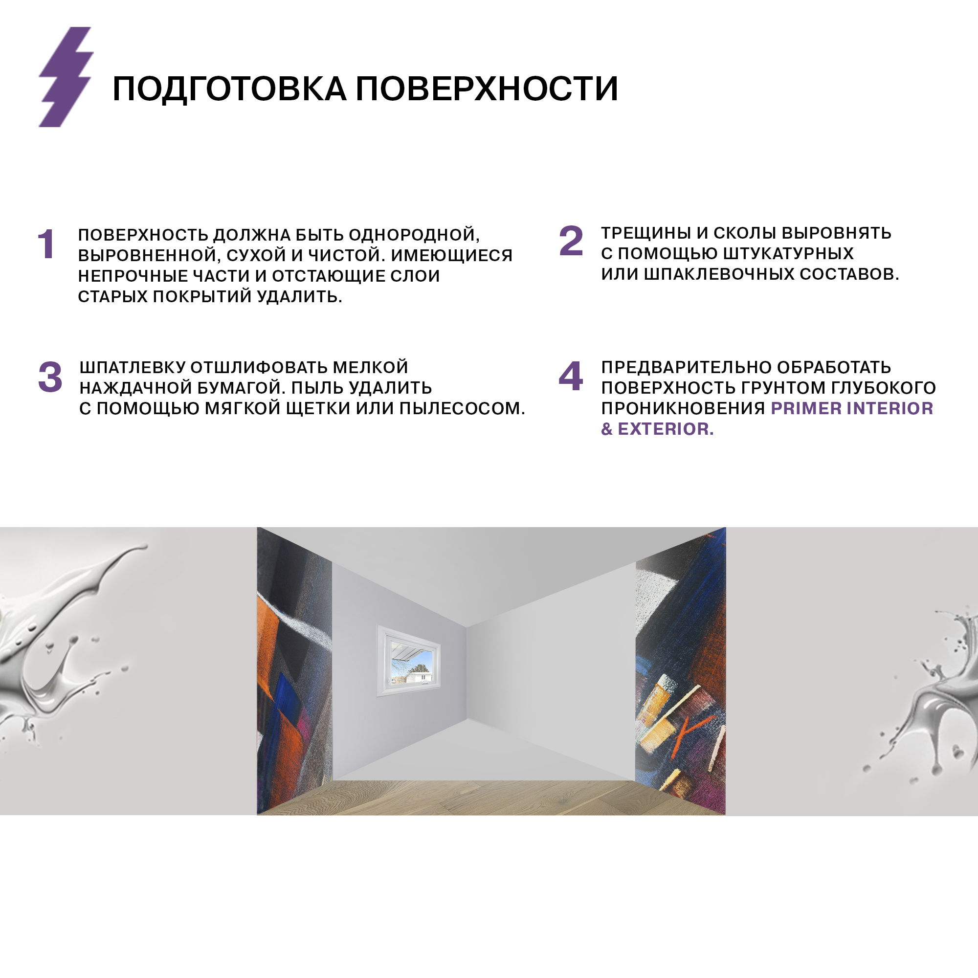 Поверхность должна быть однородной, выровненной, сухой и чистой. Имеющиеся непрочные части и отстающие слои старых покрытий удалить. Трещины и сколы выровнять с помощью штукатурных или шпаклевочных составов. Шпатлевку отшлифовать мелкой наждачной бумагой. Пыль удалить с помощью мягкой щетки или пылесосом. Предварительно обработать поверхность грунтом глубокого проникновения Interior Primer