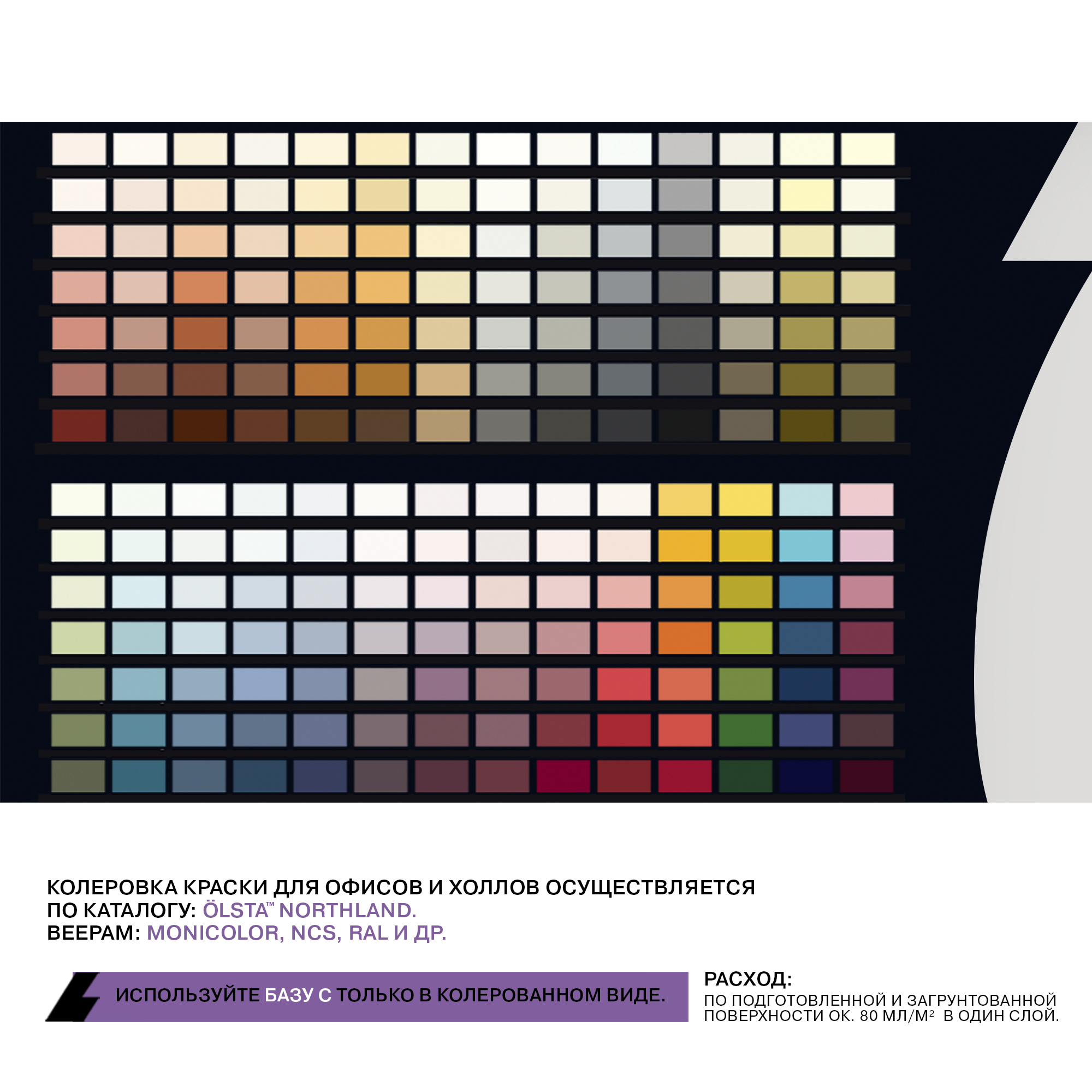 Краска для офисов и холлов Office&hall предлагается в цветах: Белый; Основа C - для колеровки в насыщенные тона.