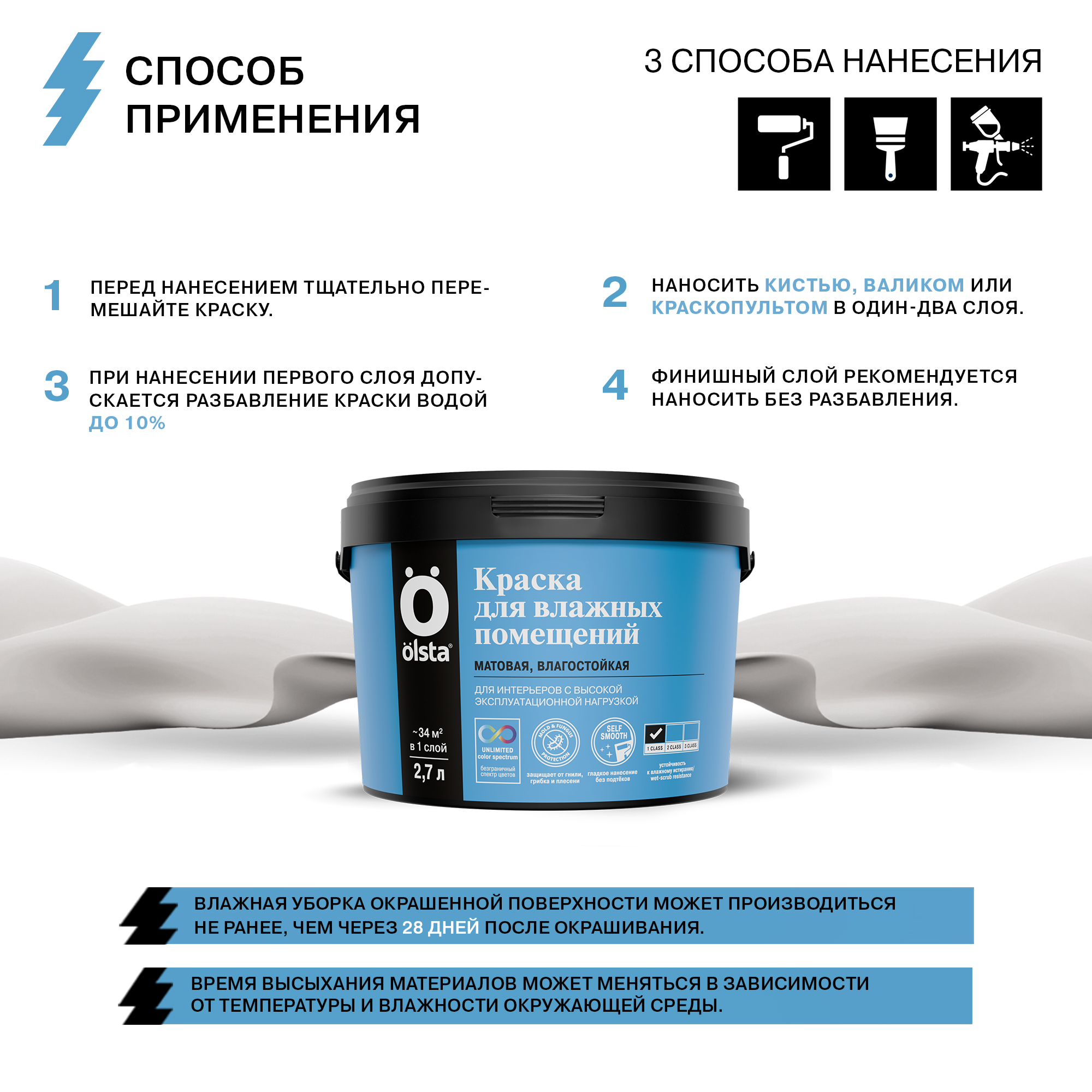 Наносить кистью, валиком или краскопультом в один-два слоя. При нанесении первого слоя допускается разбавление краски водой до 10%, финишный слой рекомендуется наносить без разбавления. Влажная уборка окрашенной поверхности может производиться не ранее, чем через 28 дней после окрашивания.