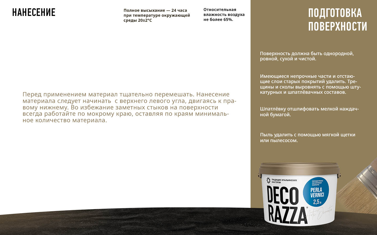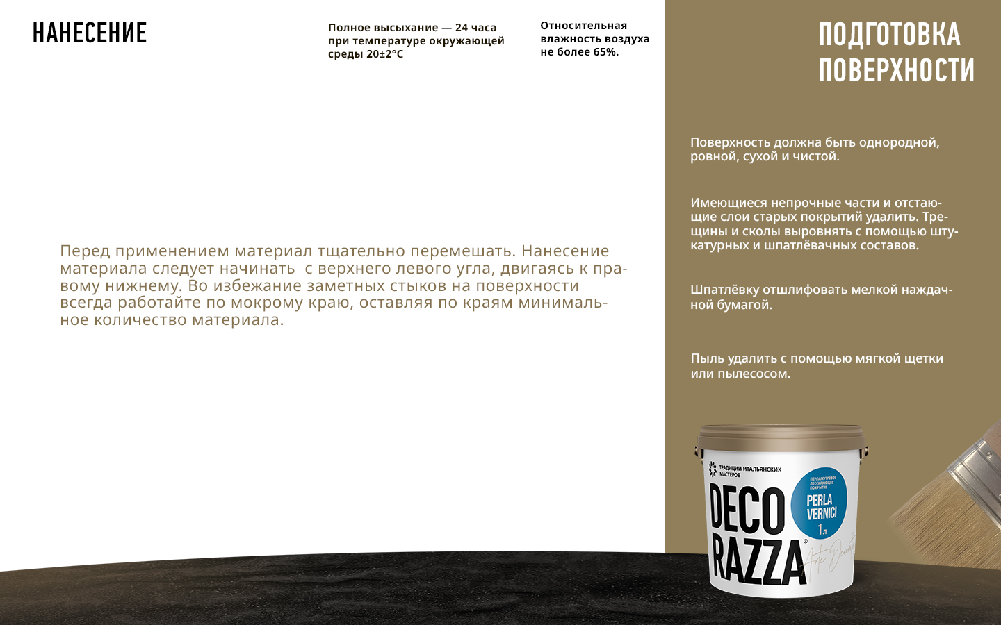 При температуре окружающей среды + 22°С и относительной влажности не более 65 %: Лессирующий состав Perla Vernici: сухой на ощупь через 1 час, полное высыхание через 24 часа, влажная уборка не ранее, чем через 28 дней. Время высыхания материалов может меняться в зависимости от температуры и влажности окружающей среды. |