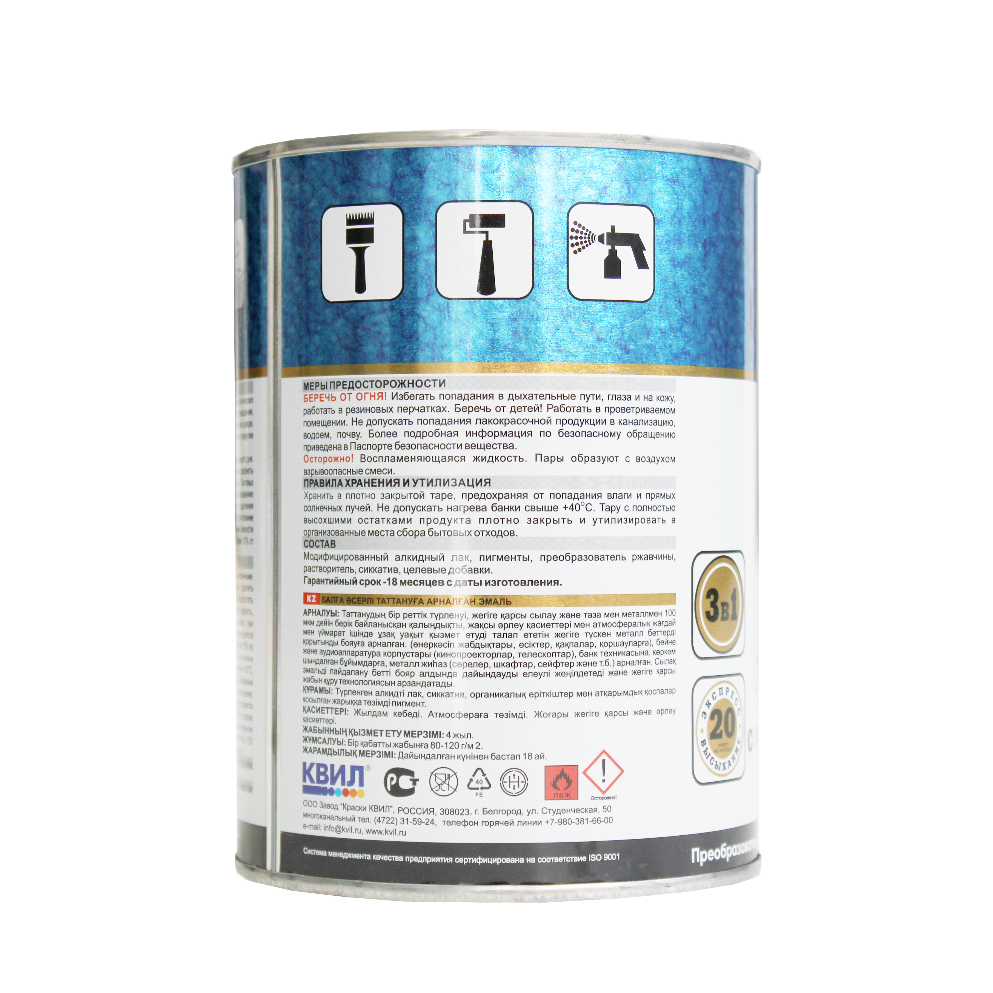 Для одновременного преобразования ржавчины, антикоррозионного грунтования и финишной окраски чистых и прокорродировавших металлических поверхностей с толщиной прочно связанной с металлом ржавчины до 80 мкм, требующих хороших декоративных свойств и длительного срока службы в атмосферных условиях и внутри помещений.Изготовлена на основе модифицированного алкидного лака, светостойких пигментов с добавлением сиккатива, органических растворителей и функциональных добавок.