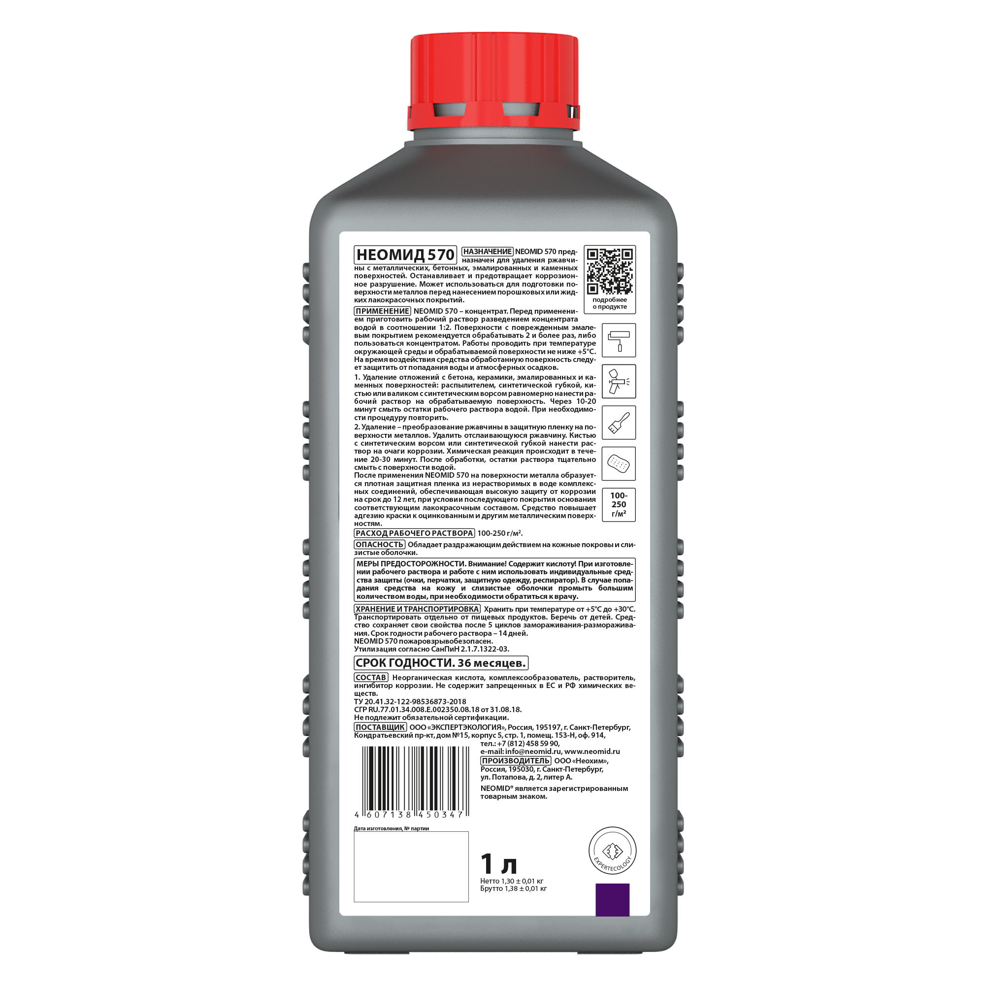 После применения NEOMID 570 на поверхности металла образуется плотная защитная пленка из нерастворимых в воде комплексных соединений, обеспечивающая высокую защиту от коррозии на срок до 12 лет, при условии последующего покрытия основания соответствующим лакокрасочным составом. Средство повышает адгезию краски к оцинкованным и другим металлическим поверхностям.
