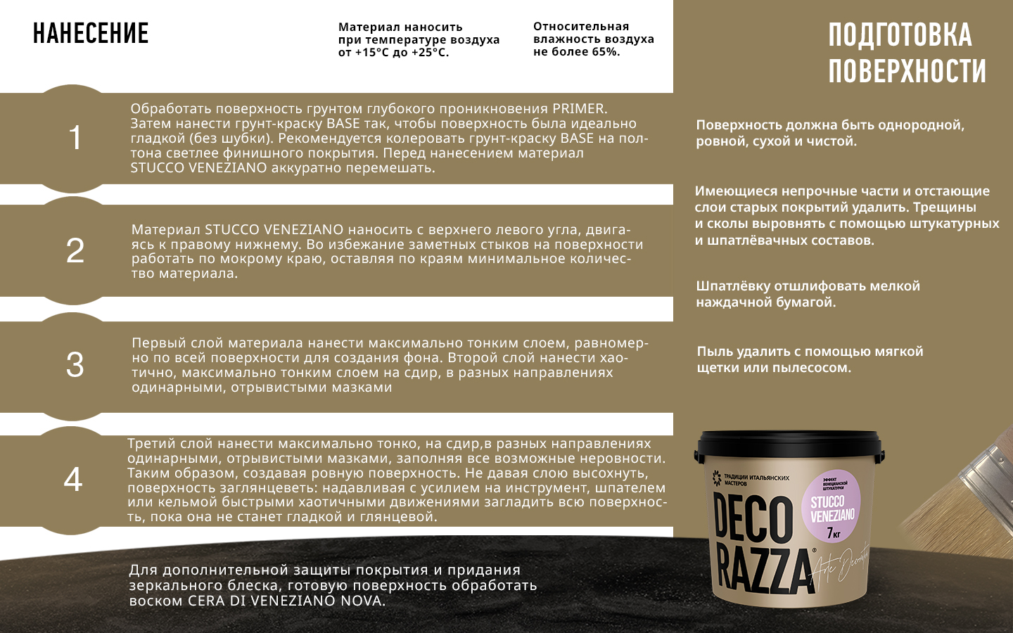 ПОСЛЕ НАНЕСЕНИЯ ВОСКА CERA DI VENIZIANO ПОКРЫТИЕ УСТОЙЧИВО К ВЛАЖНОЙ УБОРКЕ