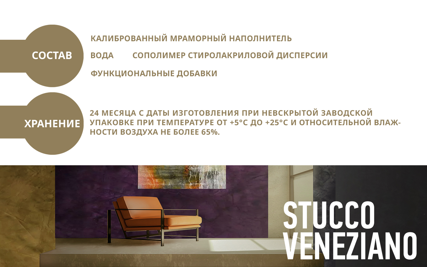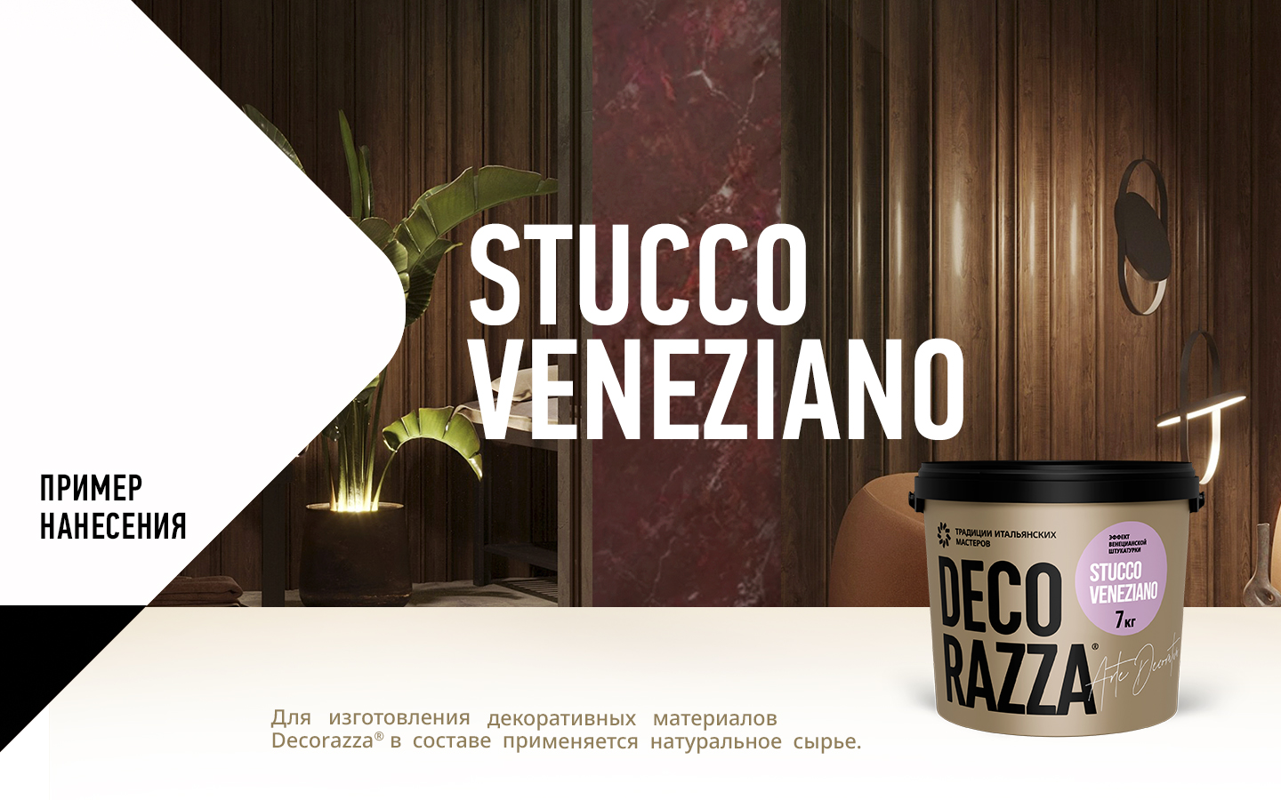 Венецианская штукатурка Stucco Veneziano позволяет воссоздать в интерьере атмосферу эпохи Возрождения с ее неповторимой роскошью и благородством. При нанесении и полировке материал достоверно имитирует изысканный мрамор, оникс и другие минералы с глянцевой полированной поверхностью, также возможно создание эффекта «Жатая ткань» и других.
